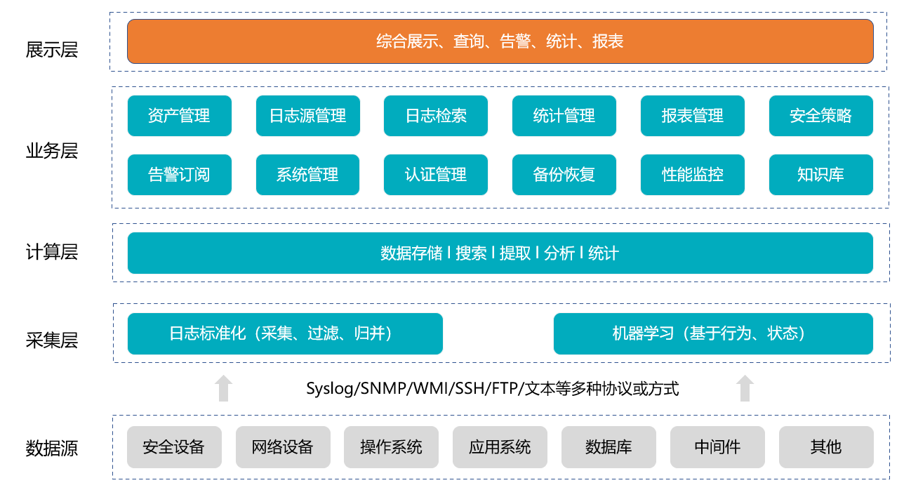 包括資產管理、日志源管理、日志檢索、安全策略、統計報表等一系列用戶實際使用業務,用戶通過不同業務功能對系統進行不同的管理操作。