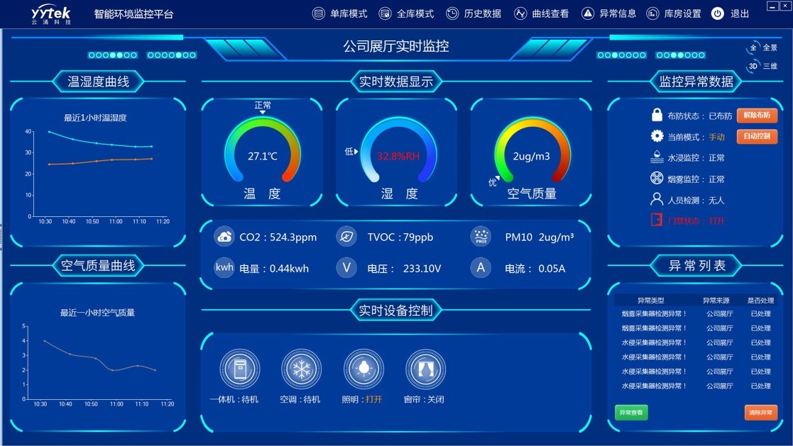 整個(gè)檔案館庫(kù)房通過(guò)接入云涌科技智慧環(huán)控系統(tǒng),采集所有檔案室內(nèi)的溫度、濕度、漏水、人員侵入等數(shù)據(jù),以便更好地通過(guò)自動(dòng)或手動(dòng)模式控制空調(diào)、除濕加濕凈化一體機(jī)、電動(dòng)窗簾、燈光等智能設(shè)備,從而達(dá)到調(diào)節(jié)溫濕度及空氣凈化的目的;除此之外,智慧庫(kù)房還通過(guò)接入視頻監(jiān)控、門禁,實(shí)時(shí)掌握庫(kù)房人員進(jìn)出情況,保證庫(kù)房?jī)?nèi)資料安全。
